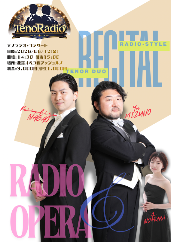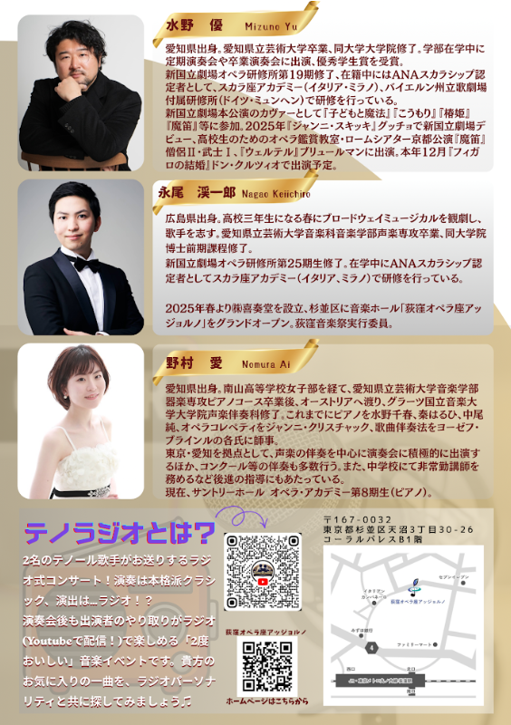 | 出演 | テノール:水野 優 テノール:永尾 渓一郎 ピアニスト:野村 愛 |